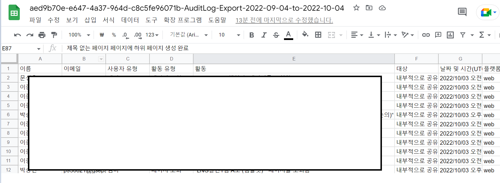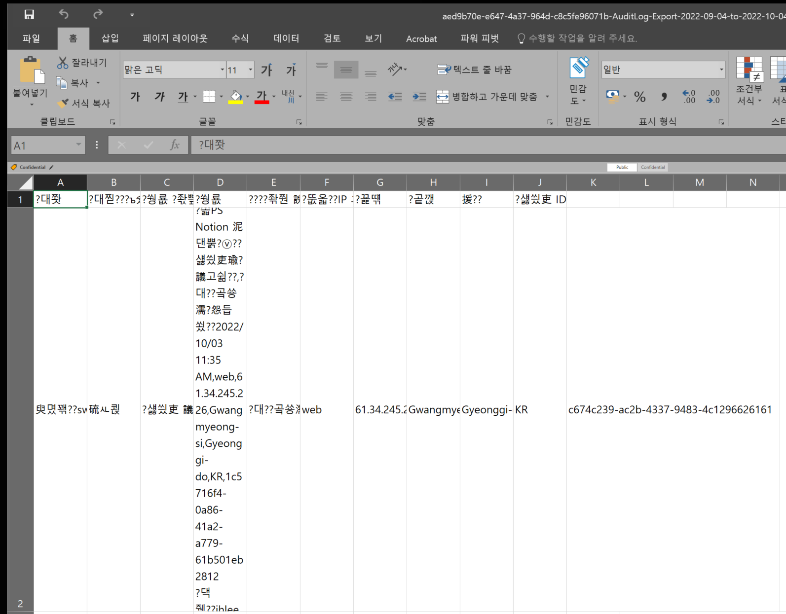 다시 감사 로그로 돌아와서, 이상하게 감사 로그를 내보내기로 다운로드하면 한글이 다 깨져서 보이더라고요.