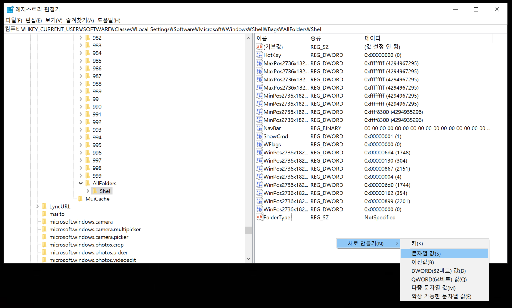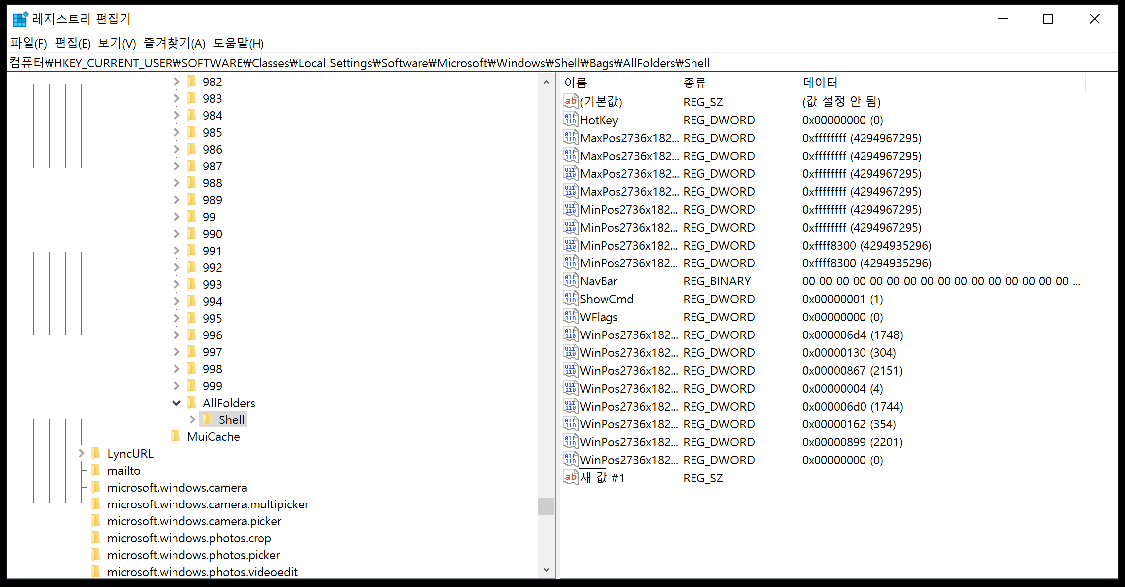 컴퓨터\HKEY_CURRENT_USER\SOFTWARE\Classes\Local Settings\Software\Microsoft\Windows\Shell\Bags\AllFolders\Shell