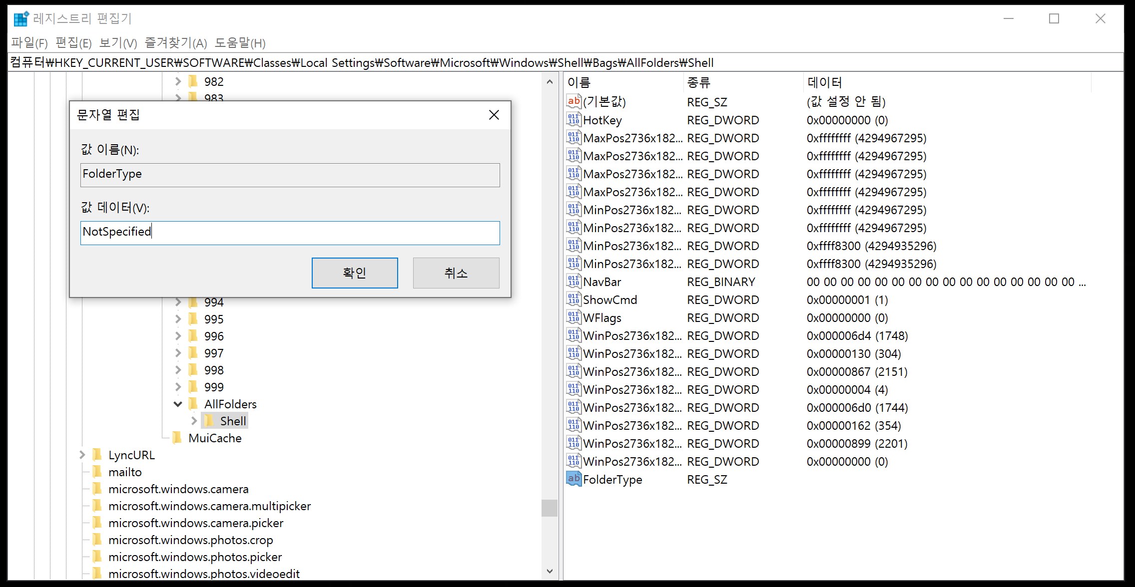그리고 'FolderType'을 더블클릭하여 값 데이터에 "NotSpecified'를 입력해 주세요.