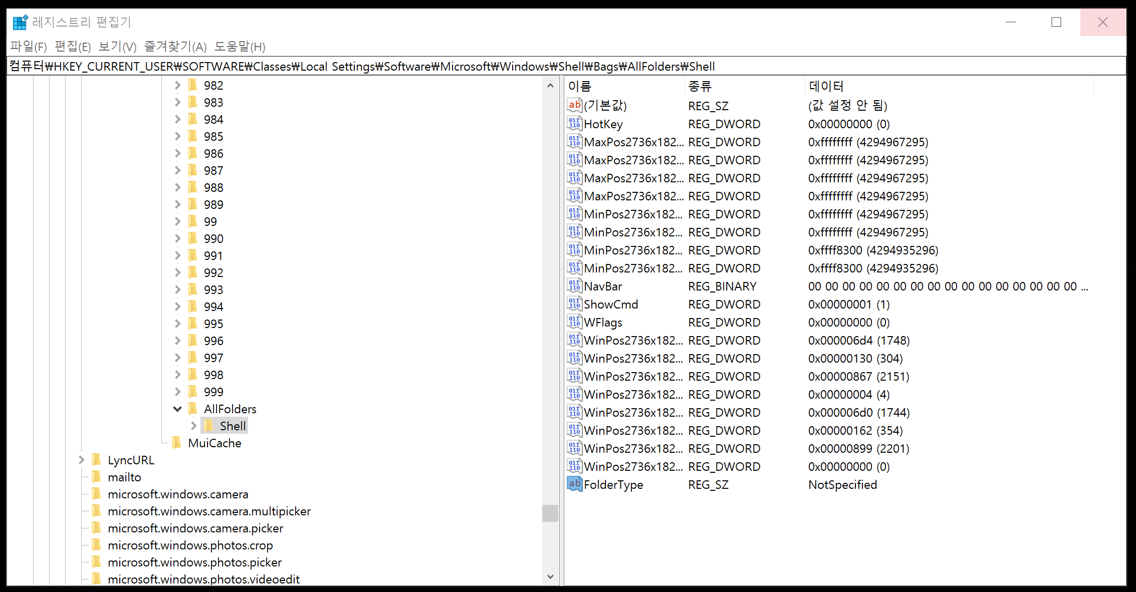 컴퓨터\HKEY_CURRENT_USER\SOFTWARE\Classes\Local Settings\Software\Microsoft\Windows\Shell\Bags\AllFolders\Shell