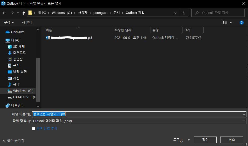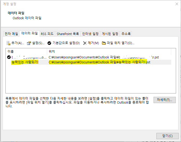 자! 그러면 이제 '데이터 파일'에 생성한 .pst 파일이 보이실 거예요!