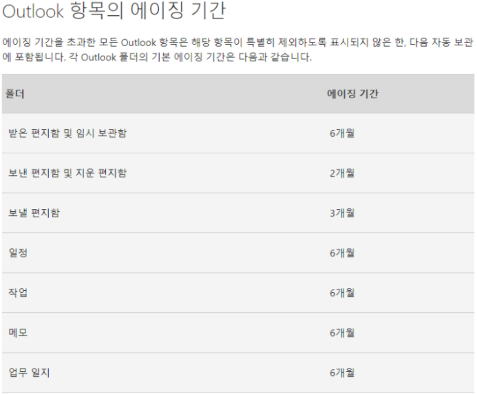 3) 만료된 항목 삭제 : 아래 아웃룩 Outlook 표에 표시된 기간이 지나면 Outlook에서 삭제한다는 말입니다.