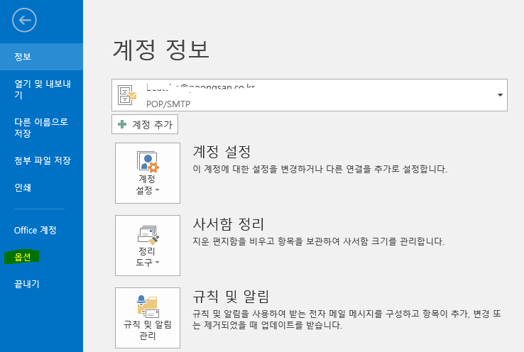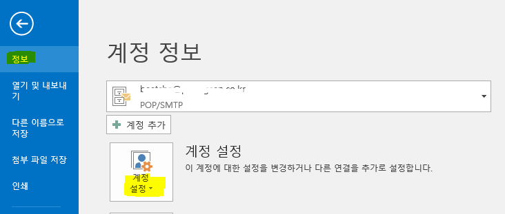 우선 아웃룩에서 '파일' - '정보' - '계정 설정' 을 클릭해주세요.