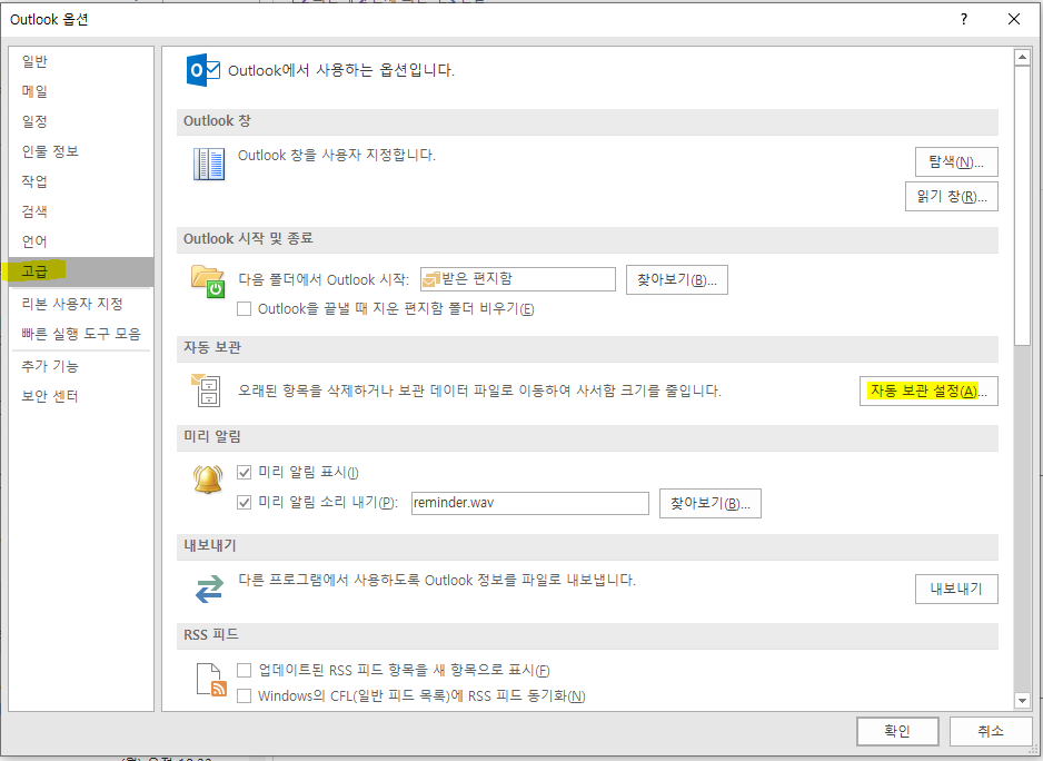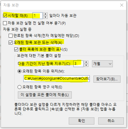 이렇게 설정이 끝나면 확인을 클릭하고 아웃룩을 껐다가 재실행해주세요! 그러면 우리가 설정한 옵션에 따라 자동 보관 기능이 실행됩니다. 저는 여기에 .pst 파일을 따로 클라우드나 D 드라이브에 또 백업을 한답니다.
