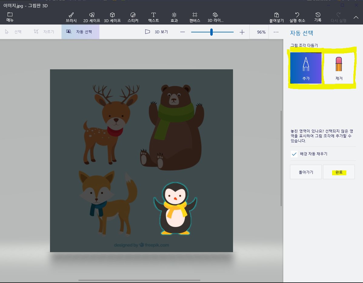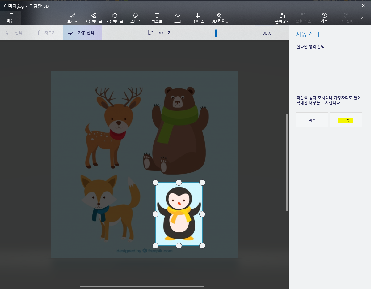 3. 자동 선택을 클린 한 뒤에 살리고 싶은 이미지 부분을 최대한 가깝게 지정해 줍니다.
