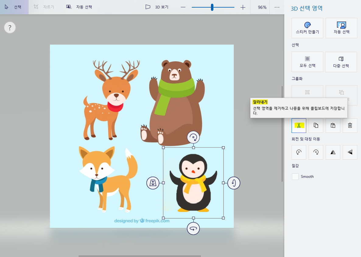 4. 선택한 이미지를 '그림 조각 다듬기' 를 통해서 필요한 부분을 살리고 필요 없는 부분을 삭제할 수 있습니다.