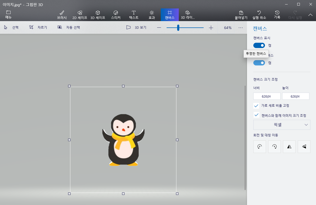 그리고 '캔버스' 메뉴를 선택 후 '투명한 캔버스' 를 활성화시켜주세요.