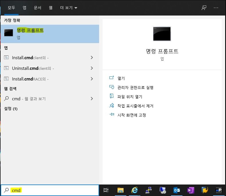컴퓨터에서 직접 확인하고 싶다면, 윈도우 검색창에 'cmd'를 입력하여 '명령 프롬프트'를 실행합니다.