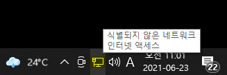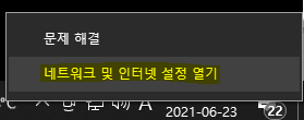 컴퓨터 화면 우측 하단에 모니터 모양 아이콘을 우클릭한 뒤 '네트워크 및 인터넷 설정 열기'를 클릭합니다.