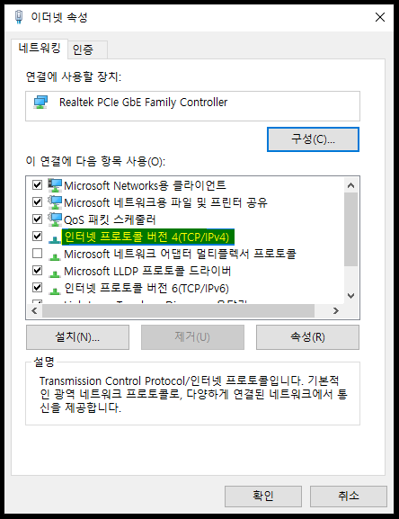 '인터넷 프로토콜 버전 4(TCP/IPv4)'을 더블 클릭합니다.