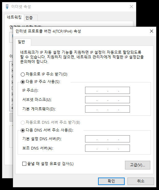'다음 IP 주소 사용'으로 IP 주소를 직접 입력하여 변경 및 고정 할당할 수 있습니다.