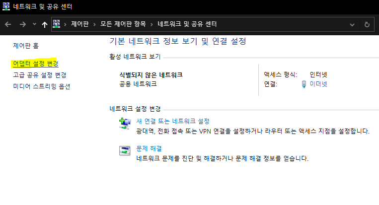왼쪽에 보이는 '어댑터 설정 변경'을 클릭합니다.