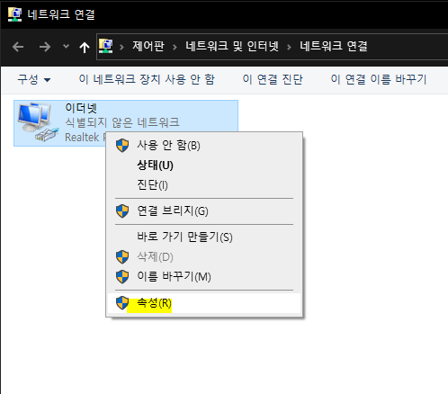 네트워크 연결에 보이는 이더넷을 우클릭하여 '속성'을 클릭합니다. 컴퓨터에 장착된 네트워크 카드 혹은 가상 네트워크 설정에 따라 이름이 이더넷이 아닐 수도 있고 여러 개가 표시될 수 있습니다.