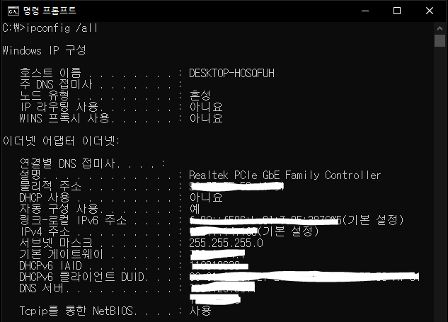 '명령 프롬프트' 화면에 'ipconfig /all'이라고 입력하면 아래 화면과 같이 자신의 IP 주소를 확인할 수 있습니다.