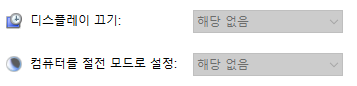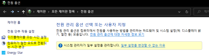왼쪽에 '디스플레이를 끄는 시간 설정'과 '컴퓨터가 절전 모드로 전환되는 시간 변경'을 각각 클릭하여