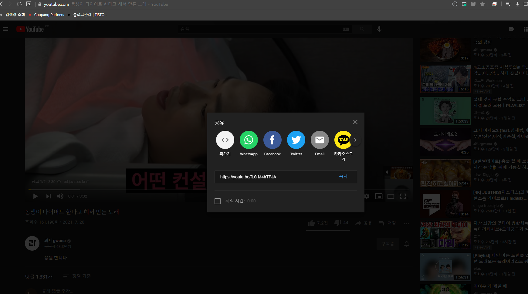 4. YouTube에 접속하여 다운로드하고자 하는 영상이나 노래의 URL을 복사합니다.