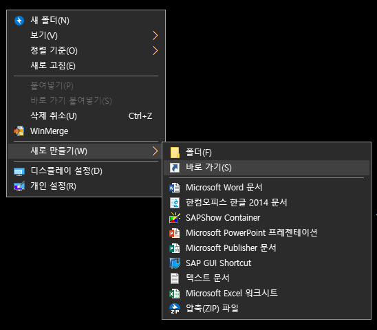 1. 바탕화면에서 우클릭 후 '새로 만들기' - '바로 가기'를 클릭해 주세요.