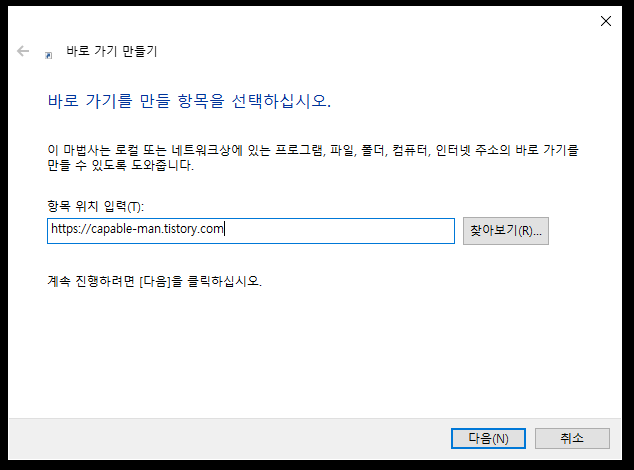 2. '항목 위치 입력' 란에 생성하고 싶은 인터넷 주소 URL을 입력한뒤 '다음' 버튼을 클릭해주세요.