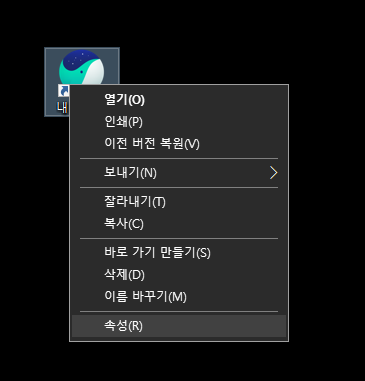 본인이 만든 바로가기를 우클릭한 뒤에 '속성'을 클릭해 주세요.