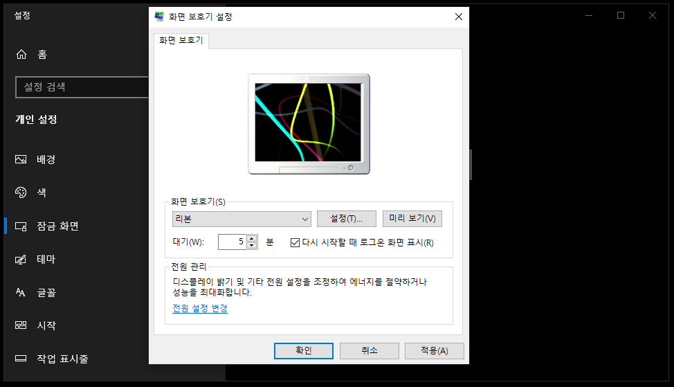'대기'는 몇 분 동안 동작이 없으면 화면 보호기로 넘어가는지 설정하는 부분인데요. 보통 5분에서 10분 정도로 설정해 두면 됩니다.