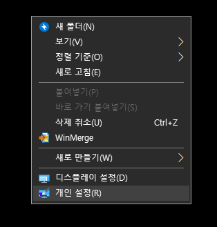 1. 컴퓨터 바탕화면에서 '우클릭' - '개인 설정'을 클릭해주세요.