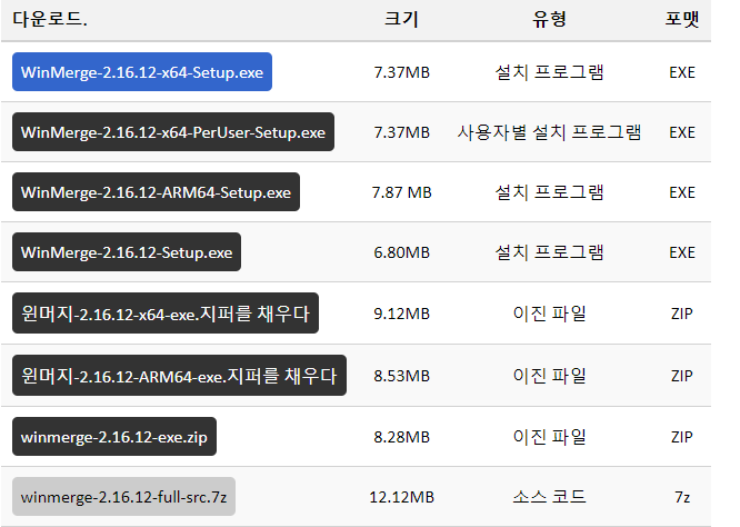 저는 윈도우 10의 64 비트를 사용하고 있기 때문에 아래 URL에서 WinMerge-2.16.12-x64-Setup.exe 이라는 설치 파일을 다운로드하였습니다. (버전에 따라 파일 이름에 숫자는 다를 수 있어요~)