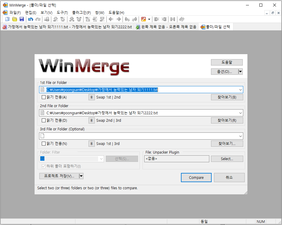 위와 같이 설치가 완료되면 WinMerge가 자동으로 실행됩니다.