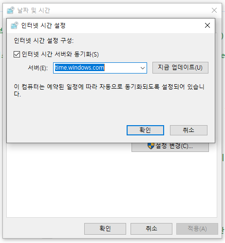 4. '인터넷 시간 설정 구성:'에서 원하는 서버를 선택한 뒤에 '지금 업데이트'와 '확인'을 순서대로 클릭해 주세요.