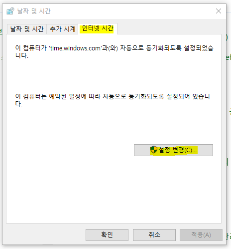 3. '인터넷 시간'을 클릭한 뒤에 '설정 변경'을 클릭해 주세요.