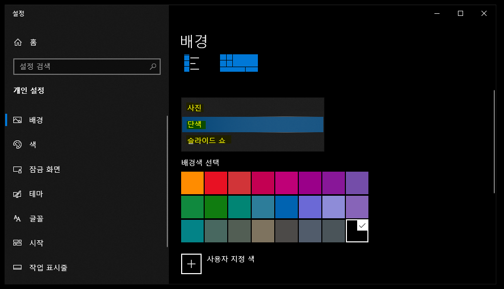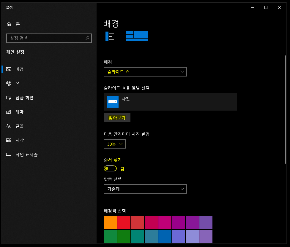 2. '배경'을 클릭하여 사진/단색/슬라이드 쇼 중에 본인이 원하는 항목을 선택합니다.