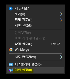 1. 바탕화면에서 마우스 우클릭을 하면 표시되는 '개인 설정'을 클릭합니다.