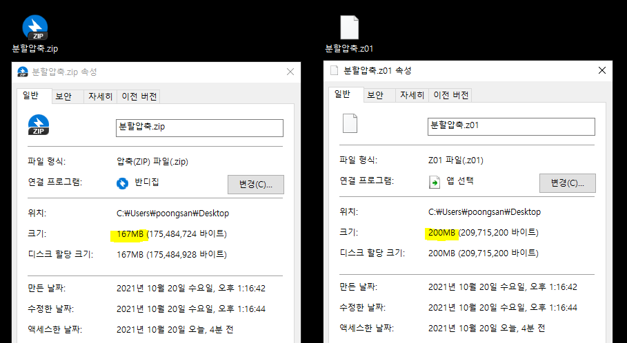 이 폴더를 200MB로 분할 압축하게 되면 2개의 파일이 생길 텐데요. 한 개는 200MB고 또 다른 한 개는 167MB의 파일이 생성되게 됩니다. (367MB = 200MB + 167MB)