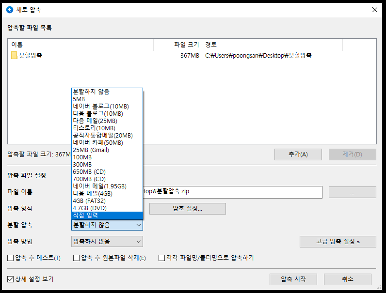 3. '분할하지 않음'을 클릭해 보면, 아래와 같이 어느 정도의 용량으로 분할 압축을 할 것인지 선택할 수 있습니다.