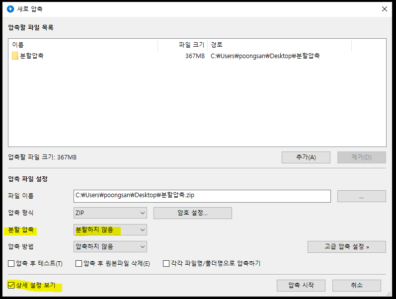 일반적으로 압축을 할 경우에, 용량이 큰 파일을 압축하면 압축파일 역시 용량이 너무 큰 문제가 생기는데요.