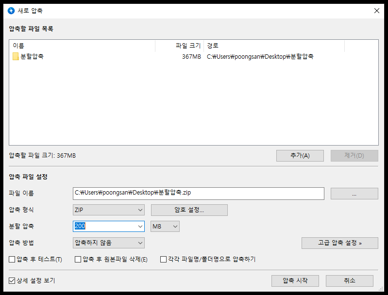 추가로 '압축 방법'에서 '압축하지 않음' 대신에 다른 옵션을 선택하게 될 경우 367MB였던 폴더를 압축하면 367MB보다 적은 용량으로 압축이 됩니다. 쉽게 말해 '압축하지 않음' 옵션에서 100MB로 분할 압축하면 4개의 파일이 생길 텐데요.