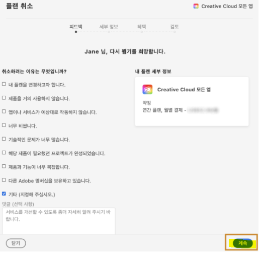 4. 플랜 취소를 클릭하면 이것저것 취소하려는 이유를 묻는데요.. 그냥 잘 대답하면서 계속을 클릭합니다.