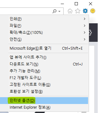 우선 인터넷 익스플로러에서 '도구' - '인터넷 옵션'을 클릭해 주세요.