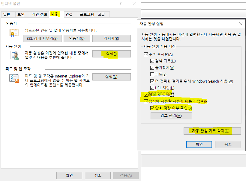 '양식 및 검색'과 '양식에 사용할 사용자 이름과 암호' 그리고 '암호 저장 여부 확인'을 선택한 뒤에
