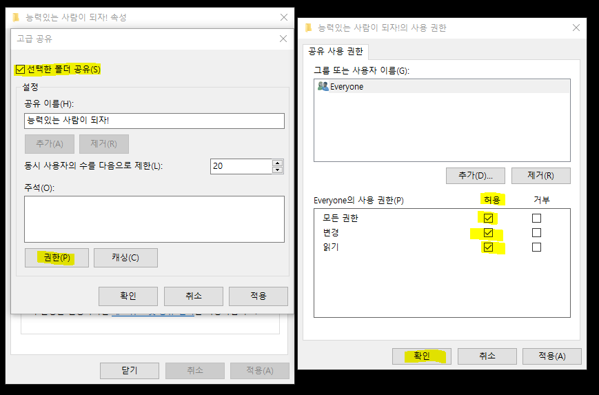 8. 다음은 중앙에 '고급 공유'를 클릭해주세요. 그리고 아래와 같이 '선택한 폴더 공유' 체크를 해주신 뒤에 '권한' 버튼을 클릭해주세요. 새로 뜬 창에 Everyone의 사용 권한을 모두 허용으로 체크해 주신 뒤에 확인 버튼을 클릭해주세요.