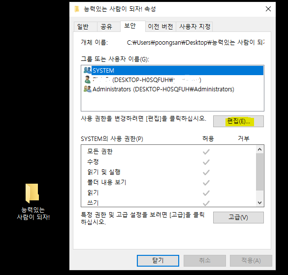 3. '보안' 탭을 클릭하신 뒤에 중간에 '편집'을 클릭합니다.