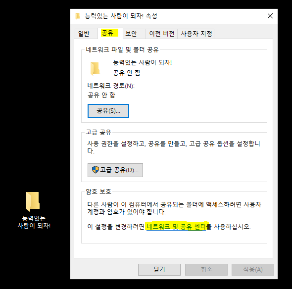 6. 자! 이제 다시 '공유' 탭으로 눌러서 아래쪽에 있는 '네트워크 및 공유 센터'를 클릭해 주세요.