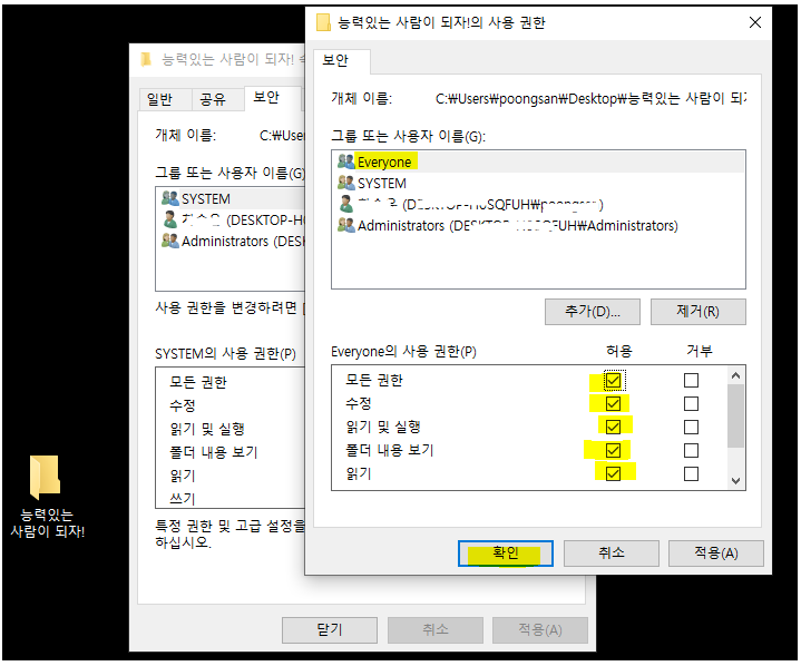 5. 이제 그룹 또는 사용자 이름에 'Everyone'이 생겼습니다! 이 'Everyone'에게 권한을 줄 건데요. 필요하신 항목들을 아래와 같이 체크하면 됩니다. 저는 전체 항목을 허용으로 체크하도록 하겠습니다. 체크를 다했다면 '확인'을 클릭해 주세요.