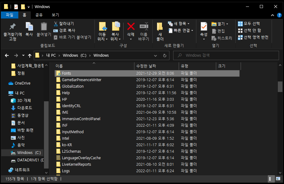 그 다음 Windows 폴더 속에 Fonts 폴더를 찾으면 끝이랍니다!