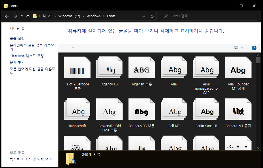 저 같은 경우에는 기본 글꼴들 위주로 사용하다 보니 아래와 같이 240개 정도밖에 없는데요.