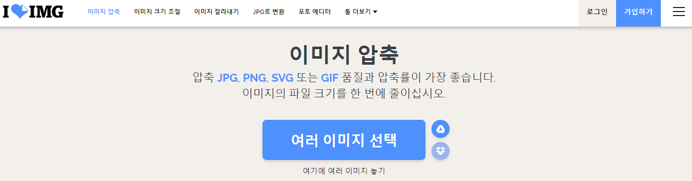 화면과 같이 '이미지 압축'부터 크기 조절, 잘라내기, 확장자 변환 워터마크까지 많은 기능을 제공하고 있습니다.