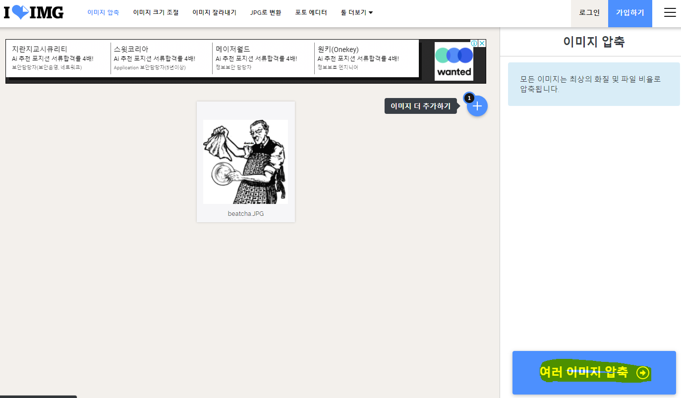 저와 같이 크기를 조절할 이미지를 업로드 한 뒤에 '여러 이미지 압축' 을 클릭하면