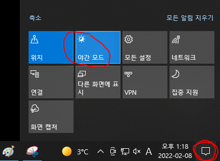 아니면 화면 우측 하단에 네모난 말풍선 아이콘을 클릭하여 '야간 모드'를 실행할 수도 있습니다.