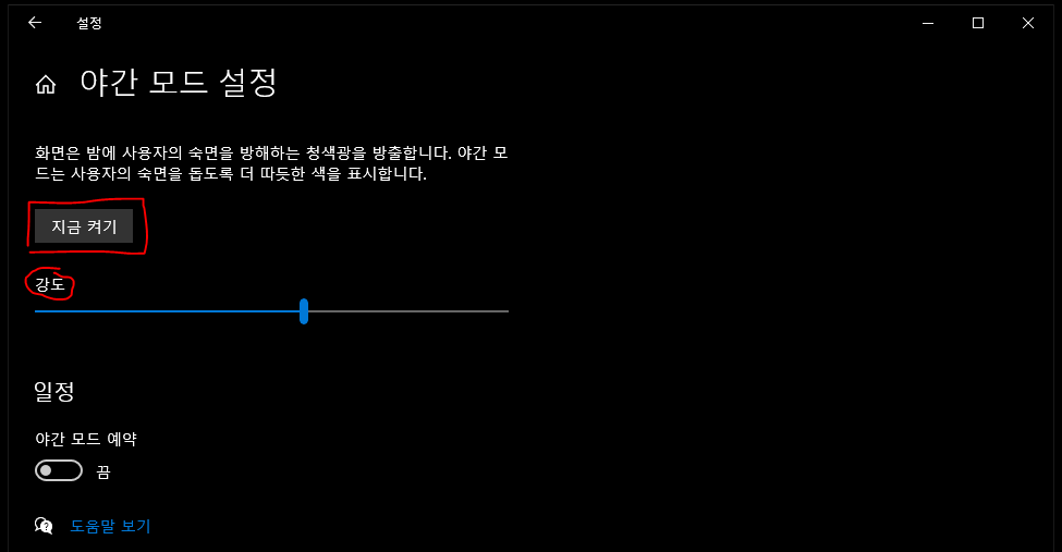 '지금 켜기'를 클릭한 뒤에 강도를 조절해 보시면 화면이 점점 노랑 빛으로 변하시는 걸 느낄 수 있을 거예요.