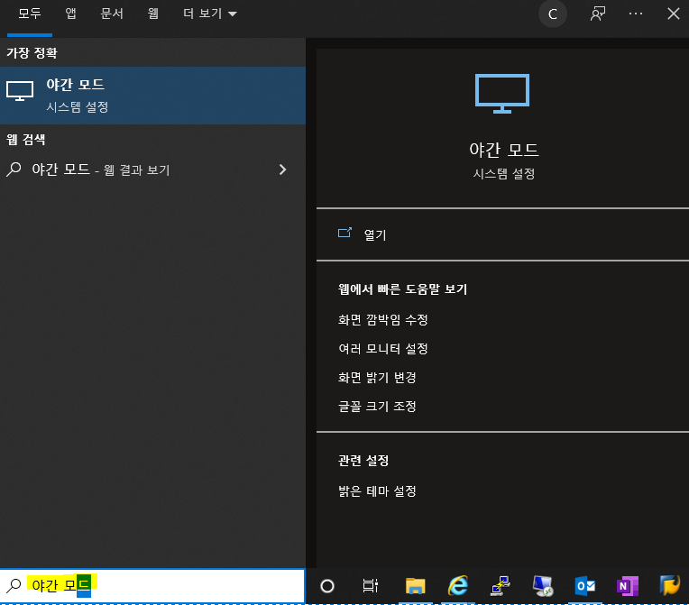 1. 우선 컴퓨터 검색에 '야간 모드'라고 검색합니다. '야간 모드'를 클릭하여 실행합니다.
