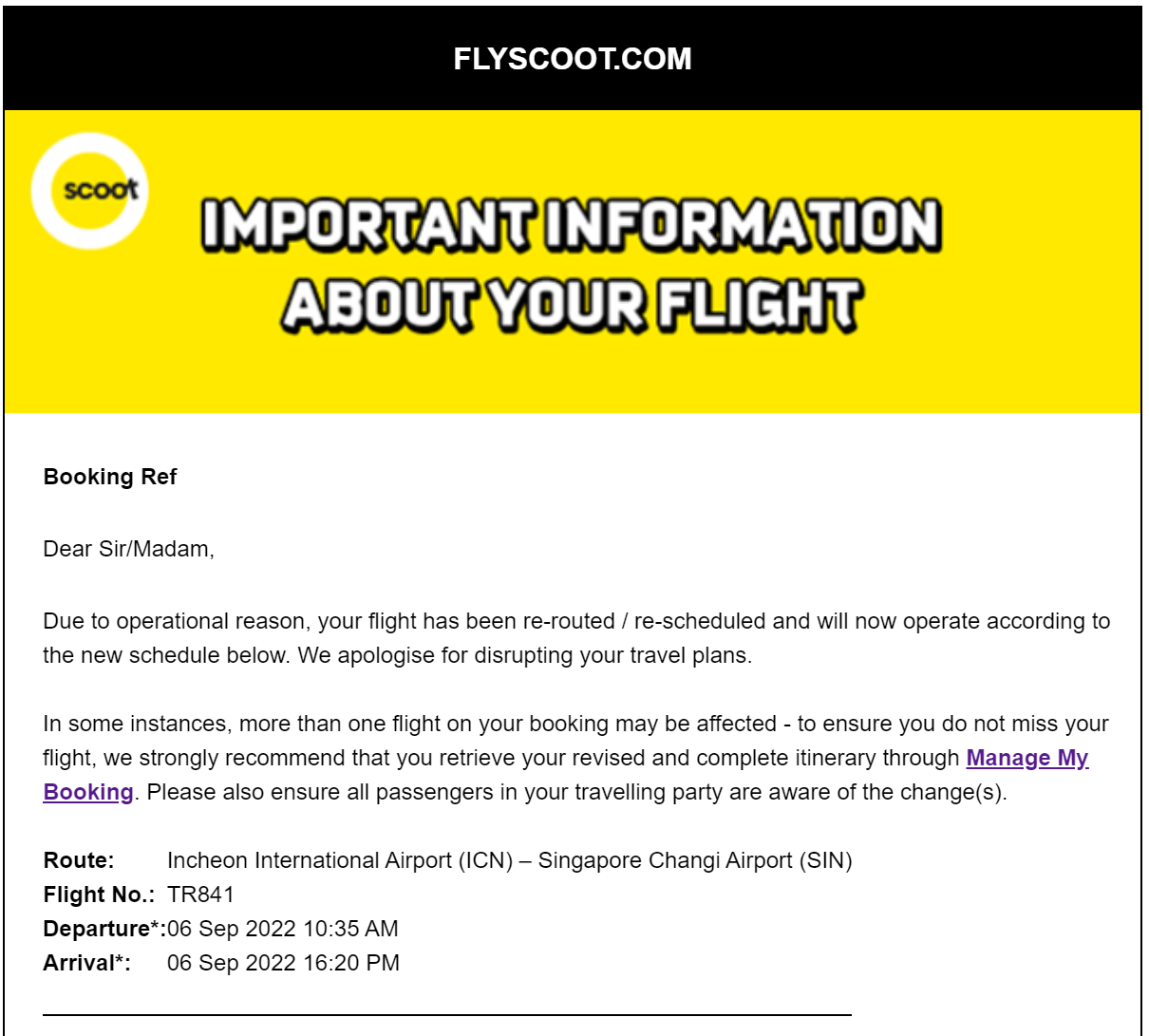 Mytrip에서 Scoot 항공사로 항공권을 예매했는데요. 며칠 있다가 이런 사태가 발생합니다.